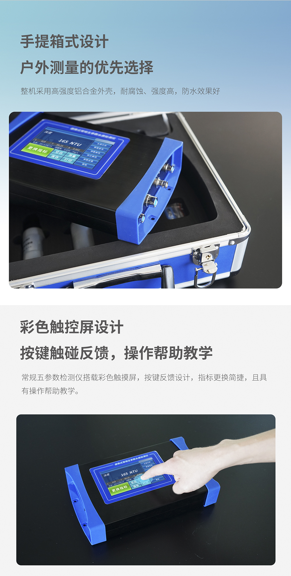 ●常規五參數水質檢測儀搭載彩色觸摸屏,按鍵反饋設計,指標更換簡捷,具有操作幫助教學。