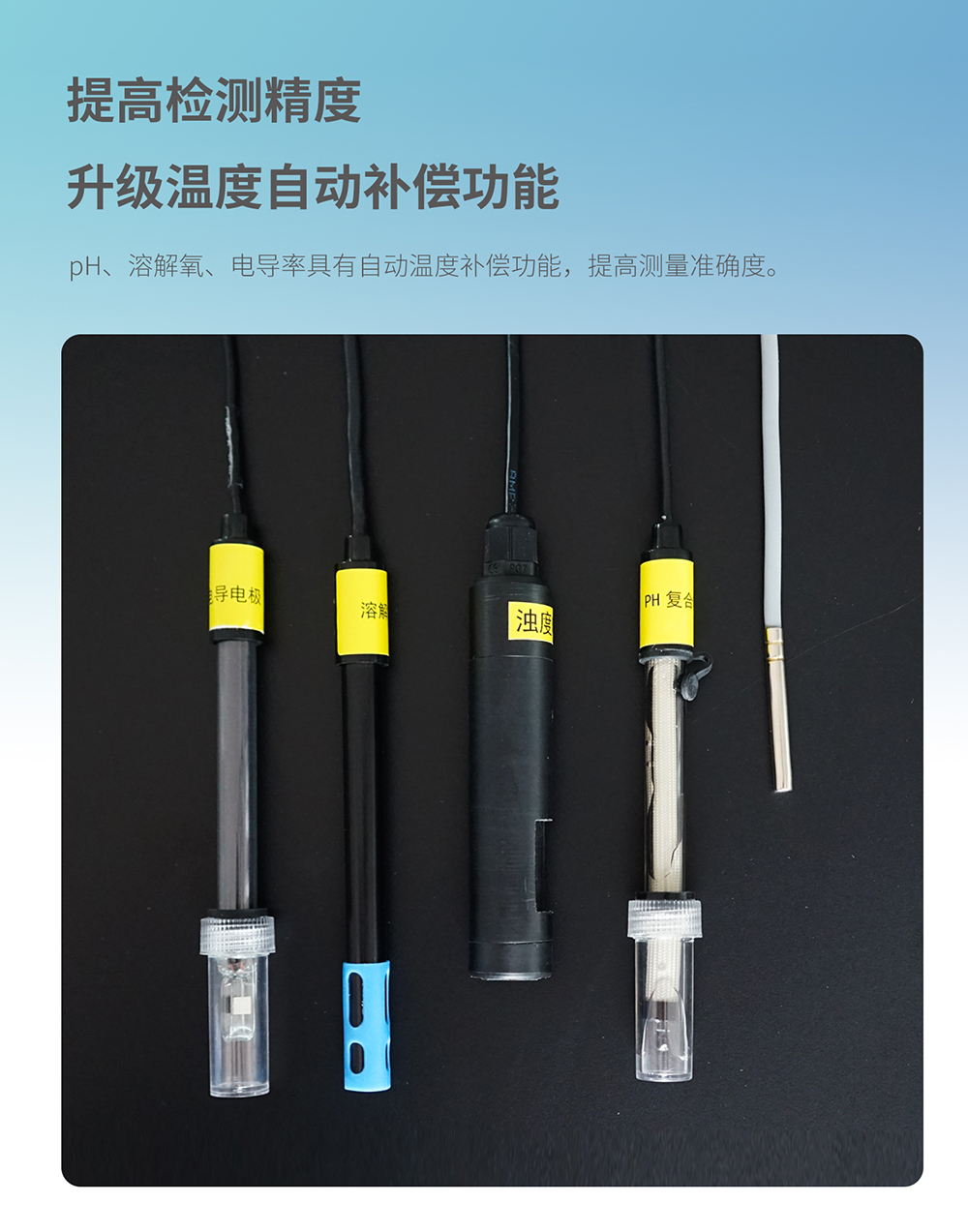 ●升級溫度自動補償功能,pH、溶解氧、電導率具有自動溫度補償功能,提高測量準確度。